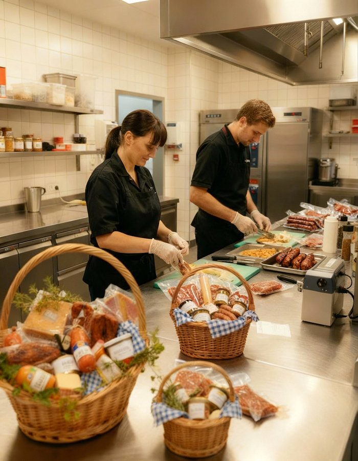 Jeder Geschenkkorb wird individuell gepackt – mit herzhaften Wurstwaren, Käsespezialitäten,